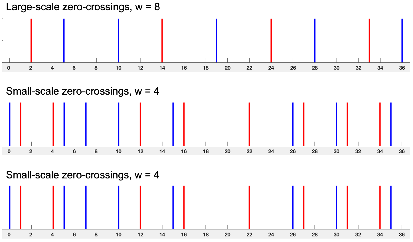 show zero-crossing segments obtained from an operator with w = 4. Assume