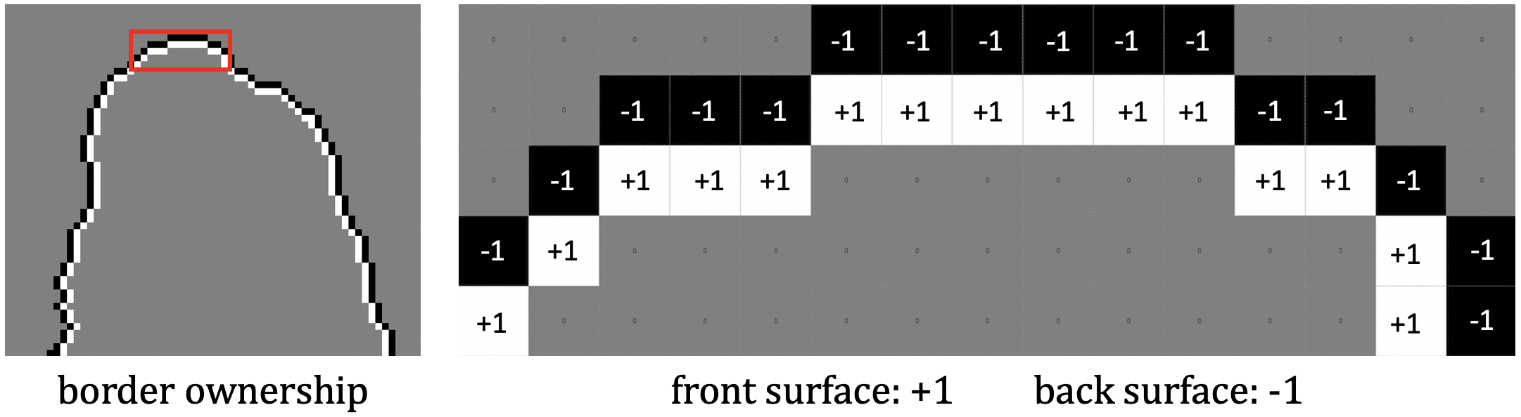 The final part of this problem is related to the concept of border ownership described in the article by Williford & von der Heydt. In a disparity map computed from stereo images, a significant change in disparity signals the presence of an object boundary in the scene, which is "owned" by the surface in front. In this part, you will implement a function that takes an input stereo disparity map and returns a matrix that encodes the side of border ownership along contours that mark significant changes in stereo disparity.