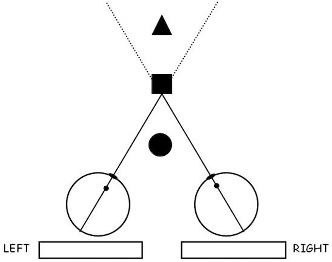 There are valid physical situations that violate the ordering constraint. One example occurs when objects are placed along a line in depth, as shown in the bird's eye view below. On this picture, first indicate where the projections of the circle, square, and triangle-shaped objects appear at the back of the left and right eyes, and sketch their approximate positions in the two image slices placed below the eyes. Assume that the eyes are focused on a point on the front surface of the square, as shown. In your diagram, clearly distinguish the circle, square, and triangle in some way. Then color in the region of 3D space in this bird's eye view that includes all possible positions of the circle that will result in stereo images of the square and circle together that violate the ordering constraint (i.e. the square and circle appear in opposite orders in the left and right images). To answer this question fully, first color the region within which the circle can be placed, so that it appears to the left of the square in the left image and to the right of the square in the right image. Then color the region where the circle can be placed so that it appears to the right of the square in the left image and to the left of the square in the right image. The combination of these two regions is sometimes referred to as the forbidden zone in the stereo literature.