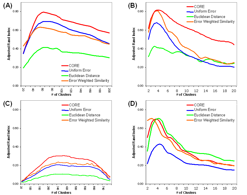 Each curve reflects the average adjusted Rand index Ra of clustering quality as the number of clusters is varied. Each data point on a curve is an average over 100 trials of generating and clustering data. Four clustering variations are considered for each data set: the CORE error model, a uniform error model, a Euclidean distance between pairs of expression profiles, and the error-weighted similarity measure between pairs of expression profiles. (A) The figure depicts the results for normally distributed synthetic data generated from 50 classes. (B) The figure depicts the results from periodic time series synthetic data generated from 4 classes. (C) The figure shows the results of clustering 904 E. coli genes belonging to 275 multi-gene operons based on expression data from 55 experiments. (D) Based on expression data from 20 experimental conditions, the figure shows the results of clustering 205 yeast genes which have each been annotated with one of four functional classifications.