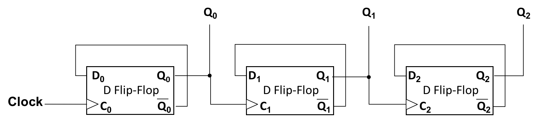 Assume the Clock input and values Q0, Q1, and Q2 are all initially 0. Draw waveforms for Clock, Q0, Q1, and Q2, showing at least ten Clock cycles. You do not need to turn in your waveform drawing, but it will help you reason about the circuit.