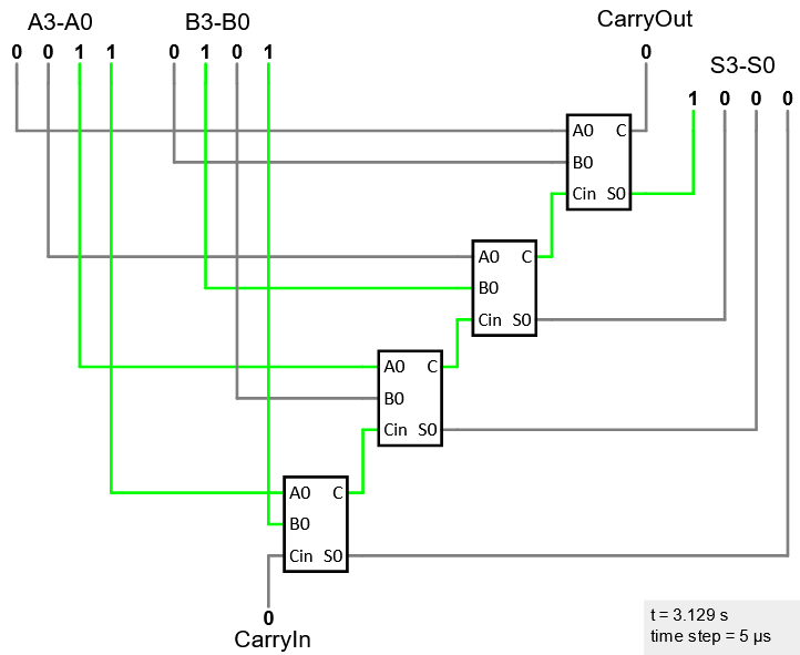 A full adder uses two half-adders to implement addition for 1 bit, with a carry-in and a carry-out.