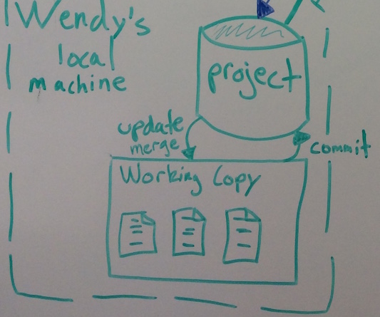 Consider: in a few commands, hg accomplished the entire tedious process of copying Wanda’s files to Wendy’s computer, painstakingly determining which files have been updated by each person, and getting the newest revision of each file in place. In fact, it can merge changes in different files and even in different parts of the same file. Wow!