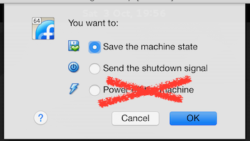Pause the appliance by clicking to close the VirtualBox window holding the wx screen. Choose Save the machine state and click OK. VirtualBox will take a few seconds to save the wx appliance’s current state, then it will close the wx appliance. The listing for the wx appliance in VirtualBox will now show it as Saved (vs. Powered Off). This is like stopping time, and is similar to sleeping/hibernating.