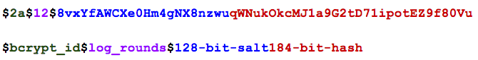 As you can see, it stores both the salt, and the hashed output in the string. It also stores the log_rounds parameter that was used to generate the password, which controls how much work (i.e. how slow) it is to compute. If you want the hash to be slower, you pass a larger value to gensalt():