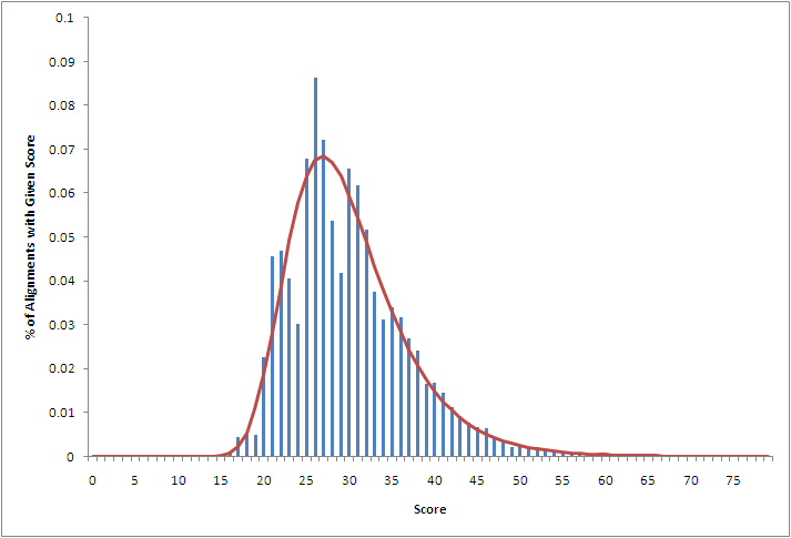 | Score | Actual # of Alignments with Given Score | Actual % of Alignemnts with Given Score | Estimated % of Alignments with Given Score |
