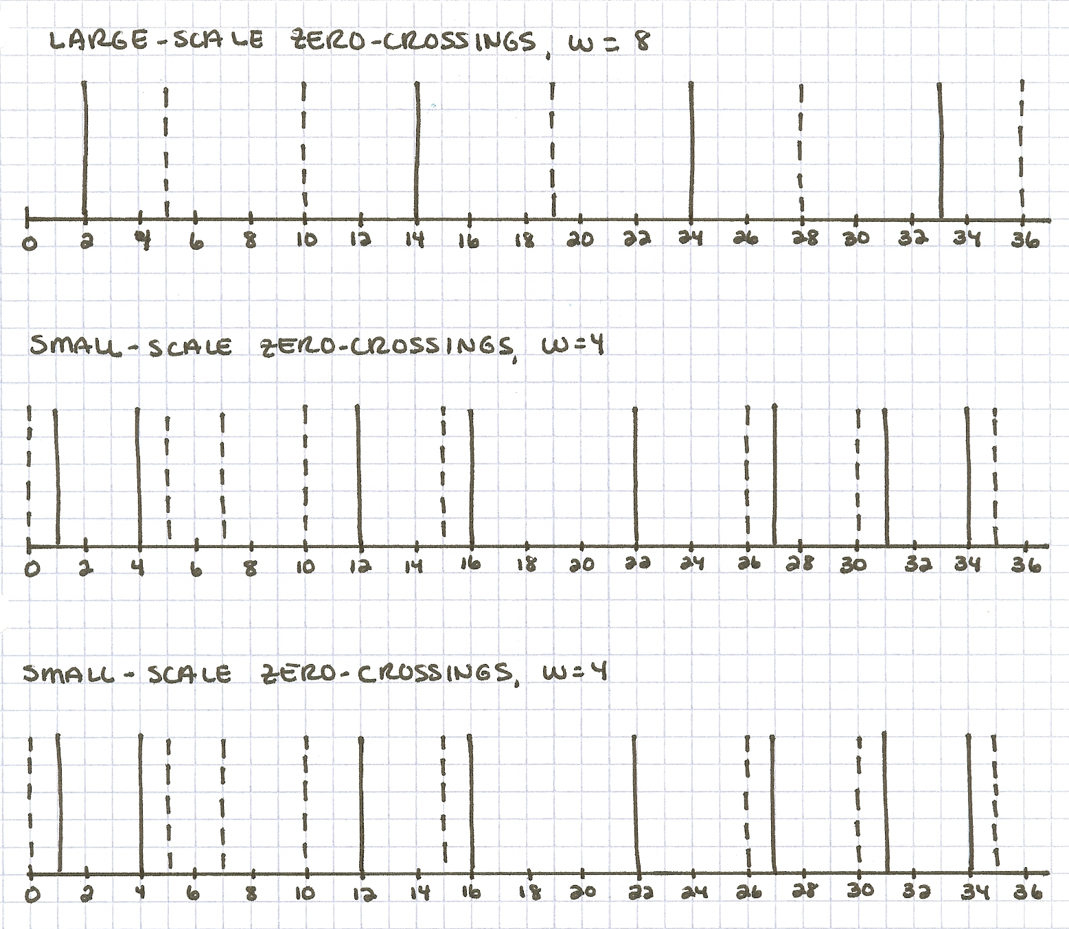 show zero-crossing segments obtained from an operator with w = 4. Assume