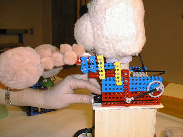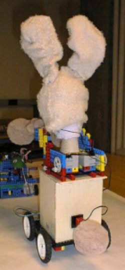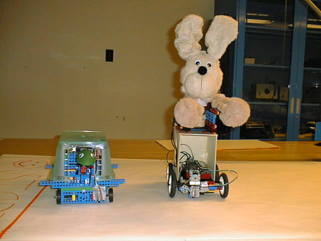 The rabbit design took many twists and turns,but as the Robotics Exhibition drew near, it came together: Mr. Rabbit was definitely a challenge to build. Jessica made several models trying to come up with the perfect rabbit. Initially, she wanted to have him move his head up and down when he fell asleep, but the head ended up being too heavy and the motors were unable to lift it after it dropped. The group decided to sacrifice that idea and have Mr. Rabbit tilt his ears up and down. Although this part seemed easy, this was the most difficult part of the body to create. The ears had to be able to bend forward, but the motor was stationary within the head. The gears had to rotate without their movement being obstructed by the cotton within the head. To give the appearance that Mr. Rabbit was actually running, we thought it would be clever if he could move his arms back and forth. Once the arms were attached and moveable, a cotton-ball tail was made to spin as Mr. Rabbit moved forward as well. Lastly, Jessica thought it would be fun if the audience could hear music during each phase of the race. She thought that it would be a snap to program little tunes into the robots. Although Mari did her best to hum the tunes, the exact codes were elusive. Ah, how wrong she was. Jessica composed two little tunes on the handy board. The first is a lullaby that plays from Mr. Rabbit when he falls alseep. The second tune is "Celebate Good Times" and plays from Mr. Turtle after he realizes he has crossed the finish line first. A third and final tune was actually borrowed from a prior Robotics project and is Taps which Mr. Rabbit plays when he reaches the finish line and realizes that he's lost. |